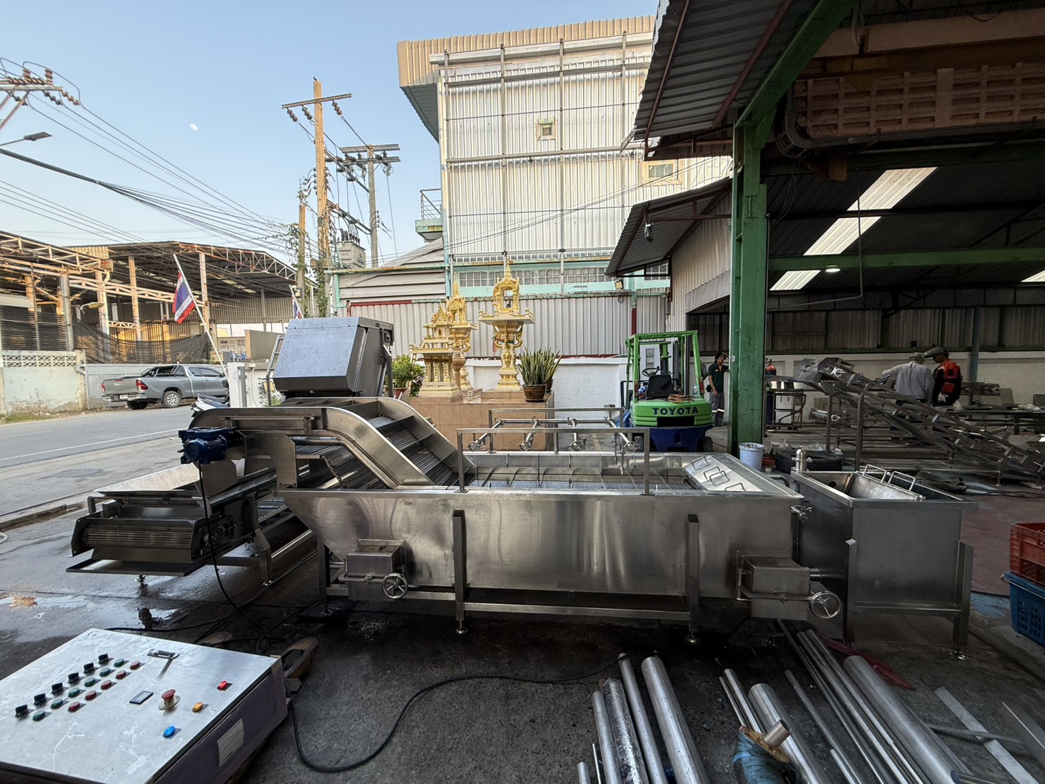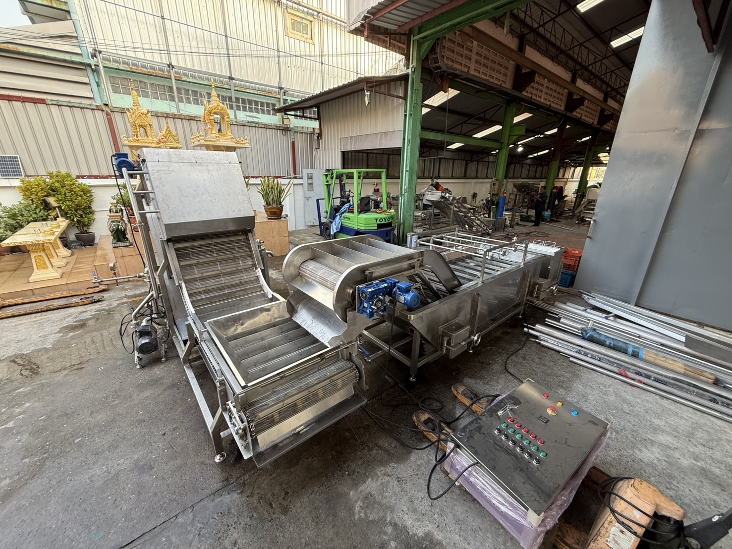 บริษัทฯ ได้ดำเนินการออกแบบ ผลิต และติดตั้งเครื่องแช่คลอรีนร่วมกับสายพานลำเลียงผลิตภัณฑ์แบบลาดเอียง พร้อมระบบล้างคลอรีน เพื่อช่วยลดการปนเปื้อนและเพิ่มความปลอดภัยด้านสุขอนามัยของผลิตภัณฑ์ก่อนเข้าสู่กระบวนการผลิตขั้นถัดไป โดยได้ทดสอบการทำงานเรียบร้อยก่อนส่งมอบ
