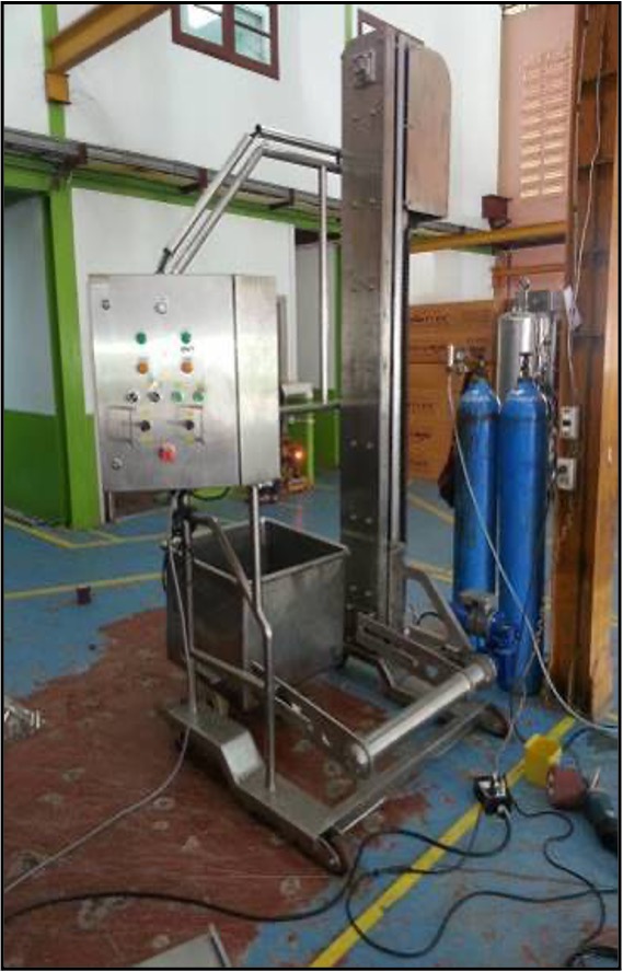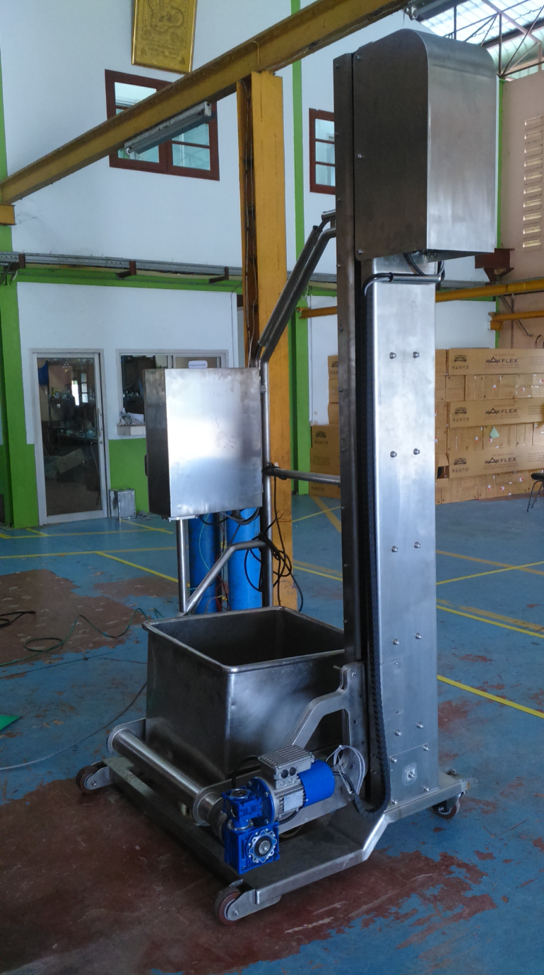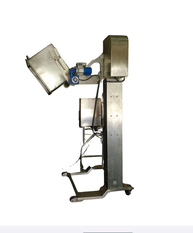 เครื่องยกและเท เป็นอุปกรณ์หรือเครื่องจักรที่ใช้ยกและเทวัตถุดิบจากถังหรือบรรจุภัณฑ์ ลงสู่เครื่องจักรหรือไลน์การผลิต โดยทำงานด้วยระบบยกแล้วเอียงถัง เพื่อเทวัตถุดิบให้ลงอย่าง รวดเร็ว ปลอดภัย และถูกสุขลักษณะ เหมาะสำหรับวัตถุดิบ เช่น เนื้อสัตว์ ผัก ผลไม้ แป้ง น้ำตาล ฯลฯ
