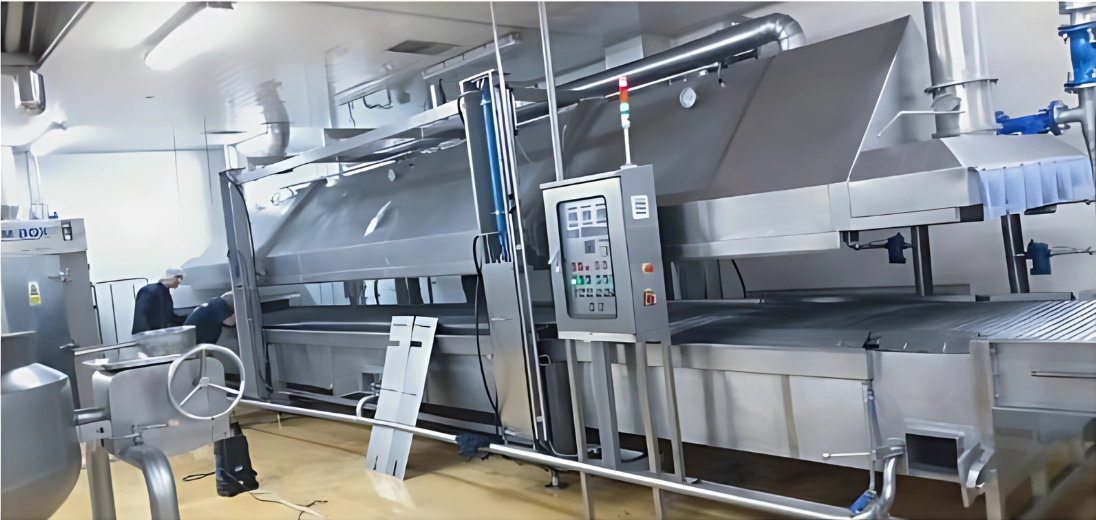 Steam Cooking Tunnel คือเครื่องปรุงสุกอาหารด้วยไอน้ำร้อนผ่านระบบสายพานลำเลียง ทำงานแบบต่อเนื่อง ช่วยควบคุมอุณหภูมิและเวลาการให้ความร้อนได้อย่างแม่นยำ ทำให้อาหารสุกสม่ำเสมอ มีมาตรฐาน และรักษาคุณภาพวัตถุดิบ เหมาะสำหรับการลวก นึ่ง หรือปรุงสุกเบื้องต้นในอุตสาหกรรมอาหารที่ต้องการปริมาณการผลิตสูงและความปลอดภัยด้านสุขอนามัย
