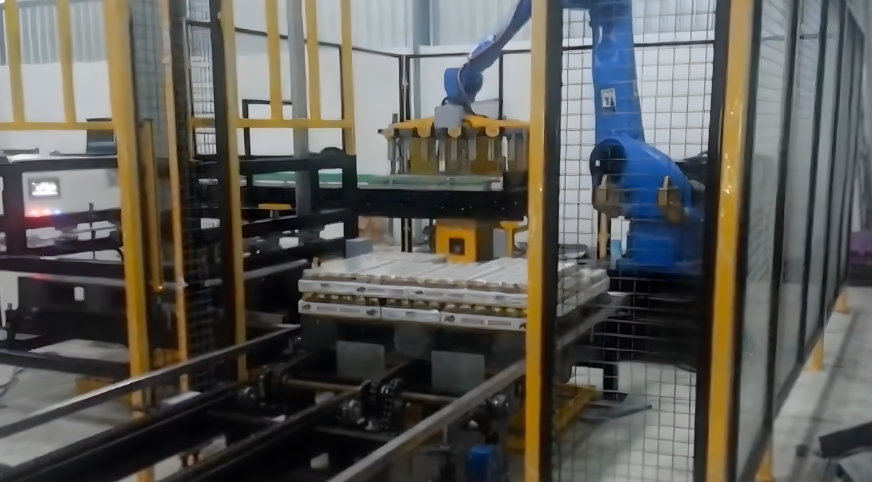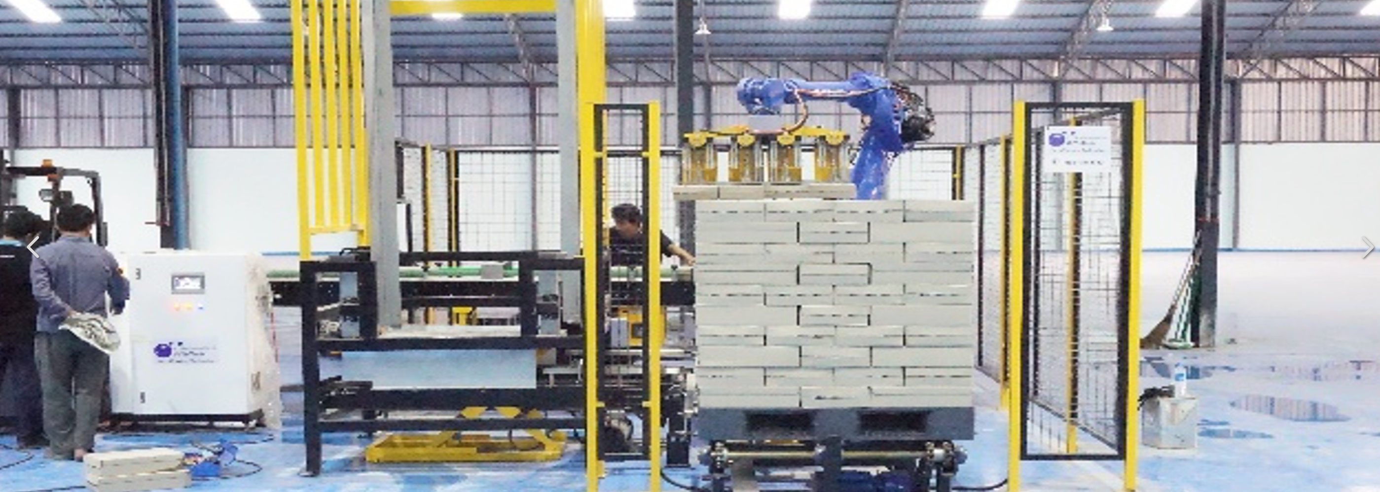ระบบหุ่นยนต์จัดเรียงสินค้าและวางสินค้าเป็นชั้นบนพาเลท โดยอัตโนมัติ ใช้แขนกลหุ่นยนต์ ร่วมกับอุปกรณ์จับยึด เพื่อหยิบ จัดเรียง ซ้อน และวางสินค้า เช่น กล่อง ถุง แพ็ค หรือภาชนะต่าง ๆ ลงบนพาเลทอย่างรวดเร็วและแม่นยำ ช่วยลดแรงงานคน เพิ่มความรวดเร็ว และคงความสม่ำเสมอในการทำงาน